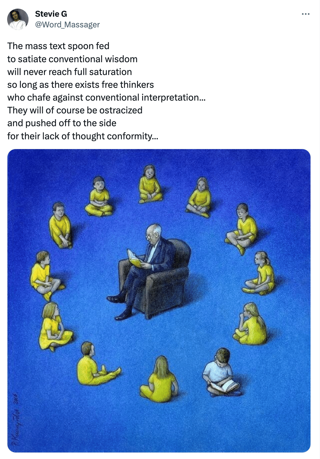 That’s all for this week. I look forward to serving you again next week. In the meantime, feel free to follow Dangers of Conformity™ on Twitter, where I tweet a few times every day, celebrating individuality and condemning mindless conformity.